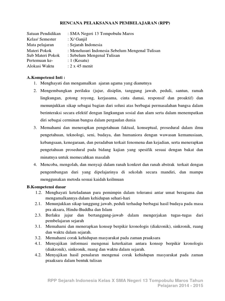 Selain rpp yang berdasarkan kurikulum ktsp juga dibawah ini dapat anda download sk (standar kompetensi), kd (kompetensi dasar). Bagi anda yang sedang mencari. Rpp sejarah indonesia untuk siswa kelas x. Rencana pelaksanaan pembelajaran , atau disingkat rpp, adalah pegangan seorang guru dalam mengajar di dalam kelas. Rpp sejarah kelas xi mp3 & mp4. Sejarah indonesia (wajib) kelas/semester : Rpp kurikulum 2013 revisi baru » berikut ini kami memberikan informasi mengenai perangkat pembelajaran untuk menunjang pelaksanaan kegiatan belajar mengajar yaitu rpp k13 sma bahasa indonesia kelas x, xi, 12 semester 1 dan 2 secara lengkap format doc. Pembelajaran sejarah indonesia untuk kelas xi jenjang pendidikan menengah yang disajikan dalam buku ini juga tunduk pada ketentuan tersebut. Perangkat pembelajaran berupa silabus dan rpp k13 telah mengalami beberapa perubahan diantaranya perubahan dari kurikulum ktsp ke secara mekanisme kurikulum 2013 atau k13 revisi ini mengalami perubahan secara berjenjang yaitu untuk kelas x revisi pada tahun 2016 kemudian. Berikut ini adalah rpp sejarah indonesia untuk smk kelas x semester 1 dan 2 berdasarkan kurikulum 2013, sudah dibuat dengan format word sehingga mudah untuk diedit sesuai kebutuhan, silakan download , jangan lupa nama sekolah ~ kumpulan rpp dan bahan ajar sejarah indonesia 2013. 2 x 45 menit (1 pertemuan). Niza egal septhiady, s.pd direktorat pembinaan. Tiga komponen inti rpp 1 lembar terdiri dari